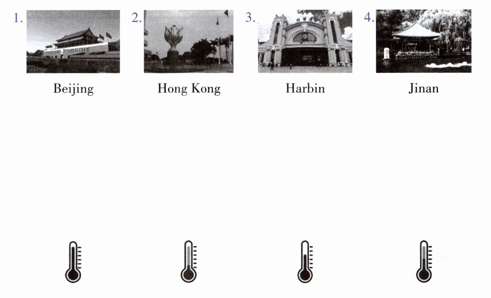 1. Beijing - cool,2. Hong Kong - hot,3. Harbin - cold,4. Jinan - warm