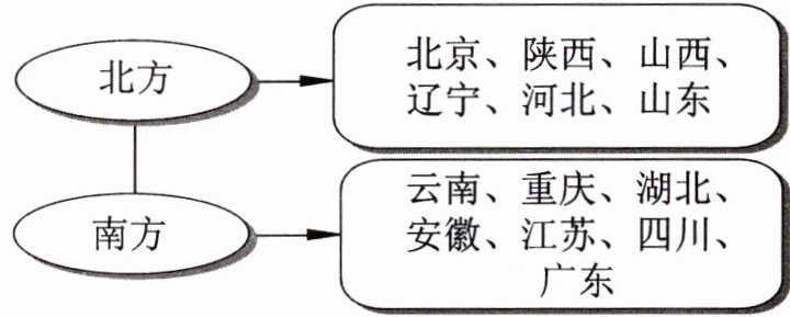 A[北方] --> B[北京、陕西、山西、辽宁、河北、山东]