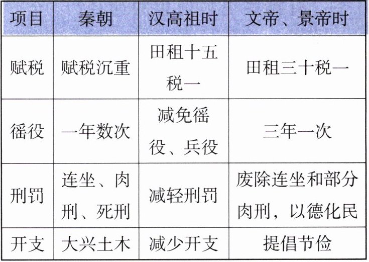 (1)休养生息政策。秦朝赋税沉重,徭役和兵役繁重,法律严苛;西汉减轻赋税和徭役,减轻刑罚,提倡节俭。