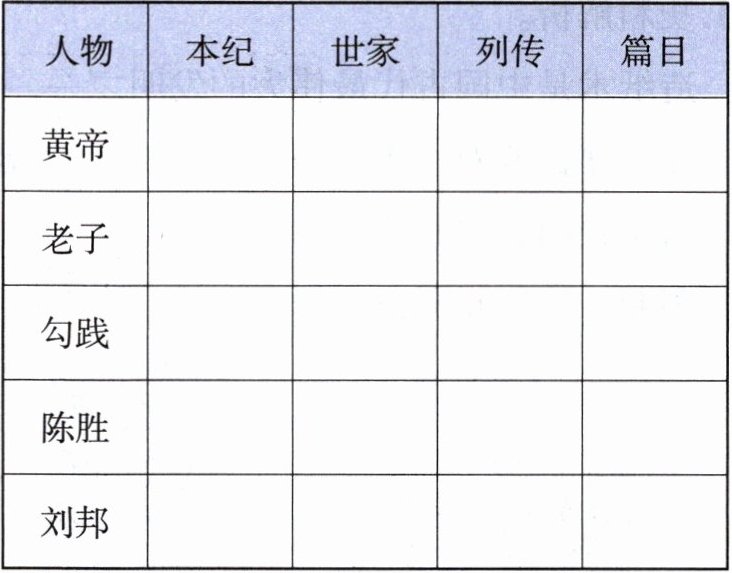 (1)下列表格中的人物在《史记》中均有叙述,请结合所学知识并查阅资料,判断他们应列在《史记》的哪一体裁中?(在表格中的相应位置画“√”)通过查找,写出他们在《史记》中的篇目名称。