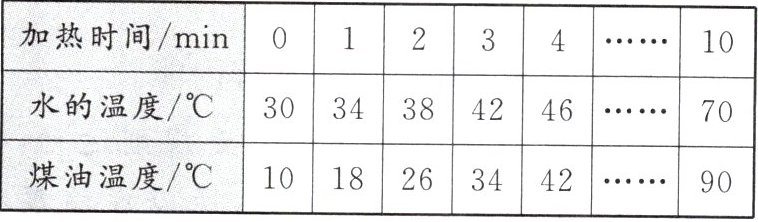 相同的水和煤油,分别倒入烧杯中,用电加热器加热,当它们吸收相同的热量时,通过比较升高的温度