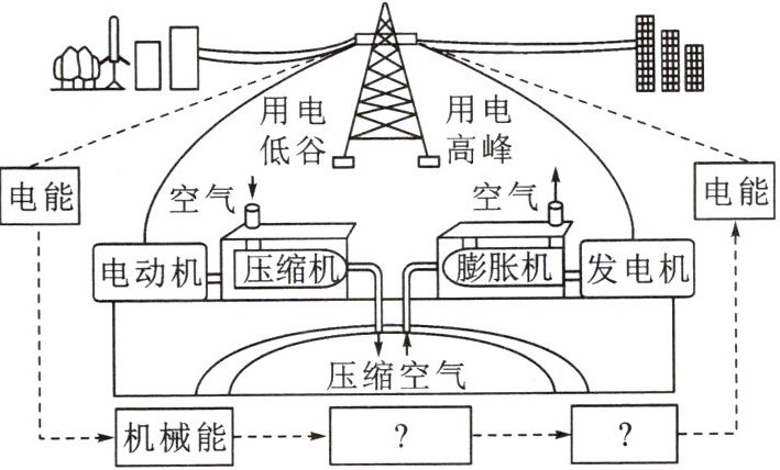 12. (湖北省中考)2024年4月30日,全球最大的压缩空气储能项目在我国并网发电,工作原理如图。在用电低谷时段利用电网多余电能驱动压缩机压缩空气,使空气