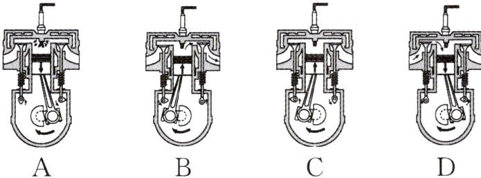 6. (临沂市中考)2024年4月20日,我国研制的全球首款本体热效率达53.09%的柴油机正式亮相世界内燃机大会,刷新了柴油机热效率的世界纪录。如图所示内燃机的四个冲程,气缸内气体的内能最小的是(