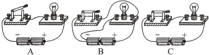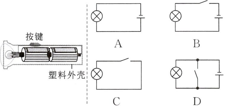 4. (天津市中考)手电筒的结构如图所示,按下按键时,电路接通,小灯泡发光。该手电筒的电路图,选项图中正确的是 (