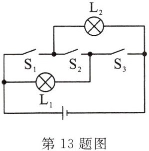13. (自贡市中考)在如图所示的电路图中,闭合开关$S_1、$$S_3,$断开开关$S_2,$则小灯泡$L_1、$$L_2$的连接方式是