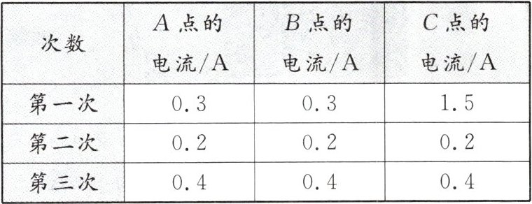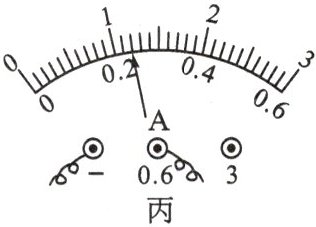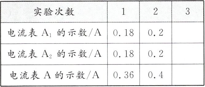 (3)排除故障后,用电流表测出通过$L_1、$$L_2$和干路的电流,记录如下表,第3次实验时电流表$A_1$指针指在如图丙的位置,其读数应为