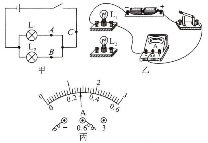 (2)用电流表分别测量A、B、C三点的电流,更换灯泡多次测量,将实验数据记录在表格中,其中第4次实验中B点的电流如图丙所示,则I_B = _________A;分析数据可知:并联电路中电流的特点是_________。