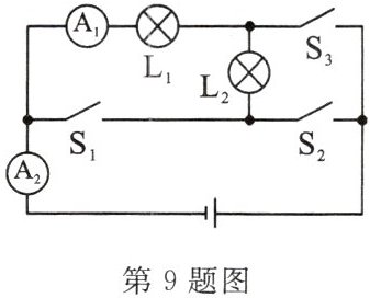 9. 如图所示的电路,只闭合开关$S_2$时,灯$L_1$和$L_2$的电流之比为