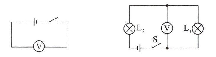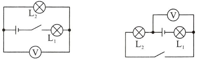 6. 在横线上写出下列电路图中,开关闭合后电压表的测量对象。(均选填“电源电压$”“L_1 $两端电压”或$“L_2 $两端电压”)