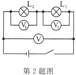2. 在如图所示电路中,闭合开关后,电压表$ V_1 $的示数为 2.5V,V 的示数为 4.5V,则电路的电源电压为