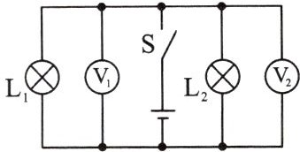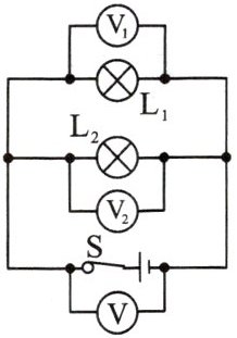 12. [科学推理]如图 1 所示的电路中,当开关闭合后$,V_1 $和$ V_2 $的示数分别如图 2 和图 3 所示。则小灯泡$ L_1 $两端的电压是