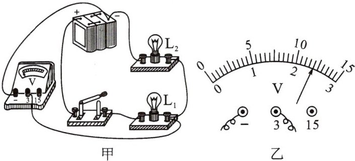 (选填$“L_1”$或$“L_2”)$两端的电压,电压表的示数如图乙所示,若电源电压为 6V,则灯$ L_1 $两端电压为3.6