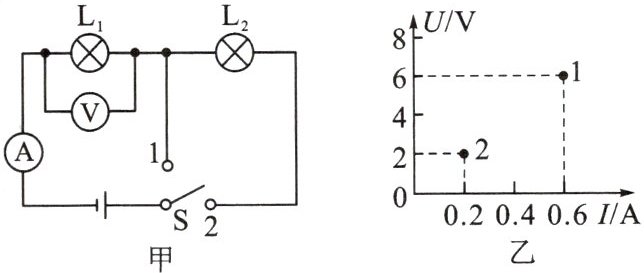 11. 如图甲所示,当开关 S 由接 1 转换到接 2 时,电压表与电流表的示数变化如图乙所示,则开关 S 接 2 时$,L_2 $两端的电压是