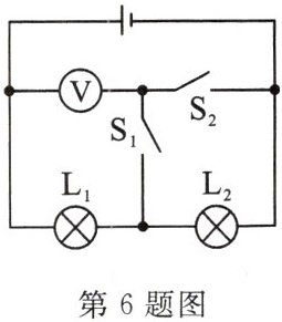 6. 如图所示,电源电压保持不变,当开关$ S_1 $闭合$,S_2 $断开时,电压表示数为 4V;当开关$ S_1 $断开$,S_2 $闭合时,电压表示数为 6V,则$ L_1 $和$ L_2 $两端电压分别是 (