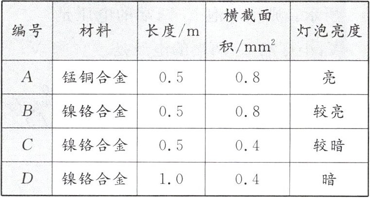 的电阻丝接入电路进行实验,可得出结论:导体的电阻大小与导体的材料有关。(4) 分别将编号为B、C的电阻丝接入电路进行实验,可得出结论:导体的电阻大小与导体的