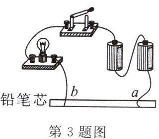 3. 如图所示的电路,导线a固定在铅笔芯上,当导线b的一端在铅笔芯上左右移动时,灯泡亮度会发生变化。这个实验说明铅笔芯是