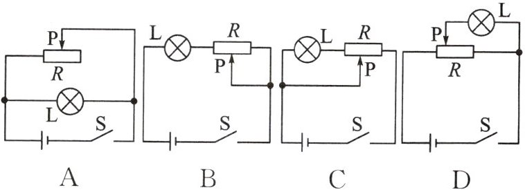 2. [科学推理]如图所示的各种电路,同种元件的参数均相等,能利用滑动变阻器调节电灯从亮到熄灭的电路是(