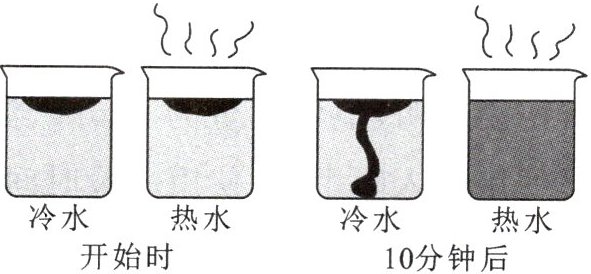 5. (成都市中考)把两滴墨水分别同时滴入盛有冷水和热水的两个玻璃杯中,实验过程及现象如图所示,分析可知物体的温度越高,分子的无规则运动越