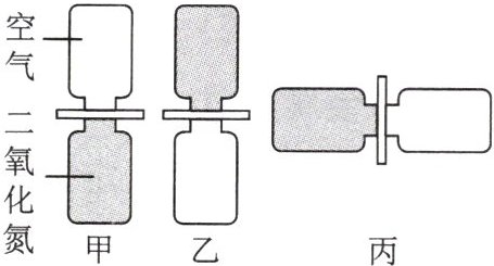 4. 如图,将两个分别装有空气和红棕色二氧化氮气体($\rho_{二氧化氮}>\rho_{空气}$)的玻璃瓶口对口对接,中间用玻璃板隔开。抽开隔板后,保持两瓶口紧贴。静置较长时间后,两瓶中气体颜色变得相同。此现象说明