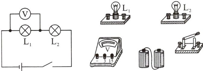 7. 已知电源电压为 3V,请根据电路图用笔画线代替导线连接实物图。
