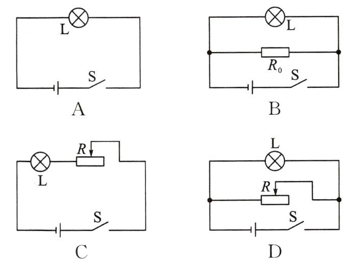 15. (广东省中考) 小明设计了一盏能调节亮度的台灯。下列符合要求的电路图是(