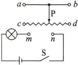4.(佳木斯市模拟)如图所示电路,在m、n两点间接人一滑动变阻器来控制电灯的亮度,电路图的上方为滑动变阻器的结构示意图,要求变阻器的滑片向右滑动时电灯逐渐变亮,则变阻器连人电路的方式应采用