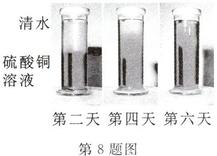 8. 如图所示,在量筒里先装入蓝色的硫酸铜溶液,再倒入一定量清水,静置几天后,硫酸铜溶液与清水的界面变模糊了,液面下降了一点。对上述现象的推测合理的是(