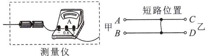 13. [科学探究]甲、乙两地相距$30\mathrm{km}$,在甲、乙两地之间沿直线架设了两条输电线,已知输电线的电阻与其长度成正比,现输电线在某处发生了短路,为确定短路位置,甲地检修员先用如图所示的测量仪接入$A$、$B$时,电流表的示数为$0.2\mathrm{A}$,乙地检修员后用相同的测量仪接入$C$、$D$时,电流表的示数为$0.3\mathrm{A}$。则短路位置离甲地(