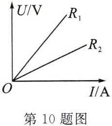 10. 在“探究电流与电压关系”的实验中,分别用$R_{1}$、$R_{2}$两个电阻进行探究,并根据各自的实验数据绘制了如图所示的$U - I$关系图像,由图像可以得出$R_{1}与R_{2}$的大小关系是(