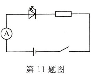 11. 二极管具有单向导电性。如图所示,将一个硅二极管和阻值为$23\Omega$的定值电阻串联,闭合开关,二极管导通,其两端电压为$0.7\mathrm{V}$,电流表的示数为$0.1\mathrm{A}$。则定值电阻两端的电压为