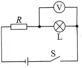8. 如图所示,电源电压$U = 10\mathrm{V}$,定值电阻$R = 20\Omega$,闭合开关$S$,电压表的示数是$6\mathrm{V}$,通过小灯泡的电流是(