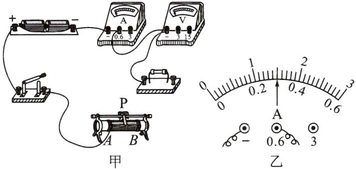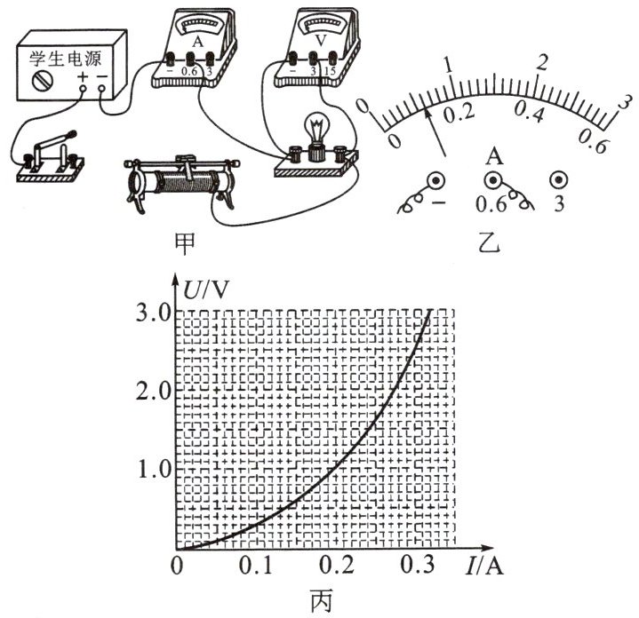 (2)移动滑动变阻器的滑片至最____端后闭合开关,使电路中的电流在开始测量时最小。向另一端移动滑片,观察到小灯泡在电压达到 $0.42V$ 时开始发光,此时电流表示数如图乙,读数为____$A$。