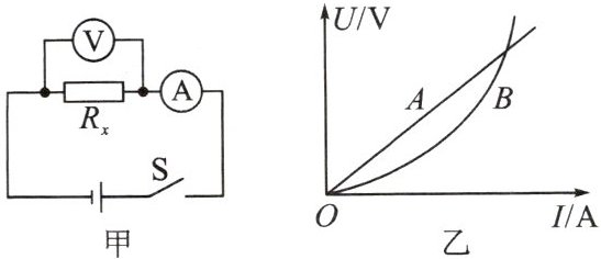 。他们利用改进后的电路进行实验,并绘制出 $R_x$ 的电压—电流图像。如图乙所示的 $A$、$B$ 两条图线中,A