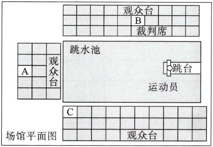 (2)[核心素养·思维能力]本期文章上线后,有同学在文章下留言说想去观看跳水比赛,但在预订门票时不知道怎么选位置。请你根据对跳水比赛的理解,向他推荐最佳席位(见下图A、B、C),并说明理由。