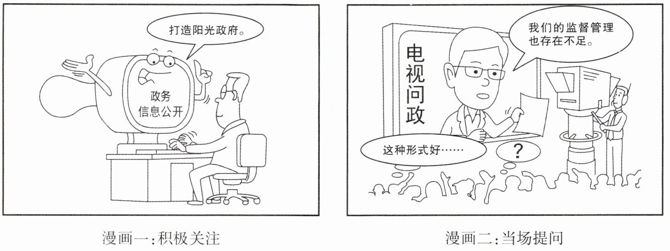 (1)民主监督。(2)政府实行政务信息公开,开展电视问政,主动接受群众监督,从政府的角度看,有利于国家机关和国家工作人员改进工作,提高工作效率,克服官僚主义,防止滥用权力,预防腐败;从公民的角度看,有利于增强公民的参与意识,激发公民的参与热情。