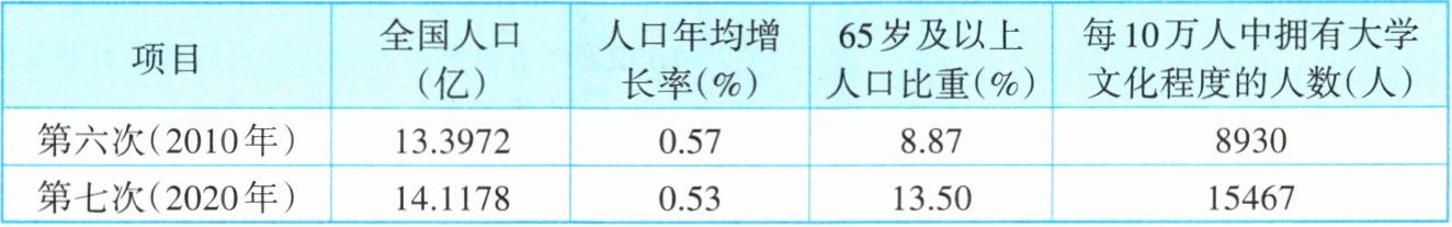 1. 下表为第六次、第七次全国人口普查数据比较表。表中数据的变化说明我国( )