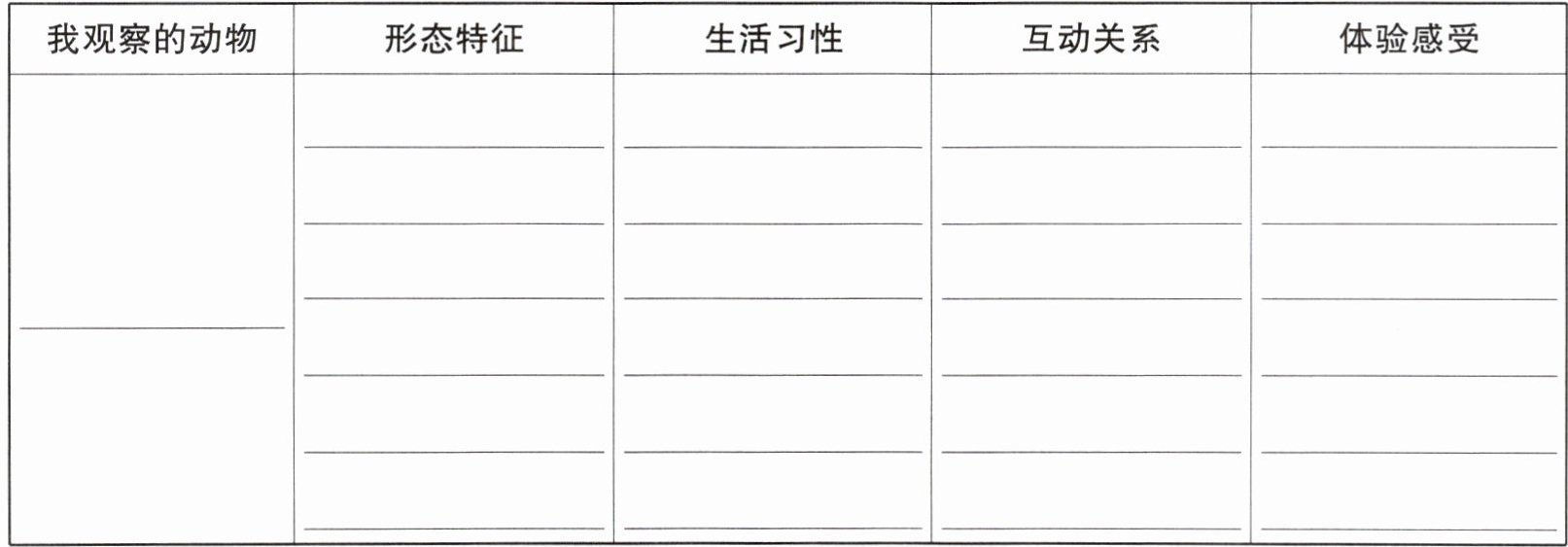2. 【观察体验,用心记录】生命是千姿百态的,不同的动物有其独特的形态、习性等。为了加深对动物的了解,请去动物园或水族馆做一次深度观察,或者养一只宠物随时观察,认真记录你眼中的动物是什么样子,它有什么样的生活习性,你与它之间有什么亲密互动,它带给你哪些奇妙的感受。