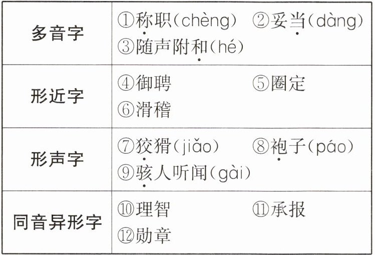 1.B【解析】①称职(chèn),③随声附和(hè),⑨骇人听闻(hài),⑪呈报。
