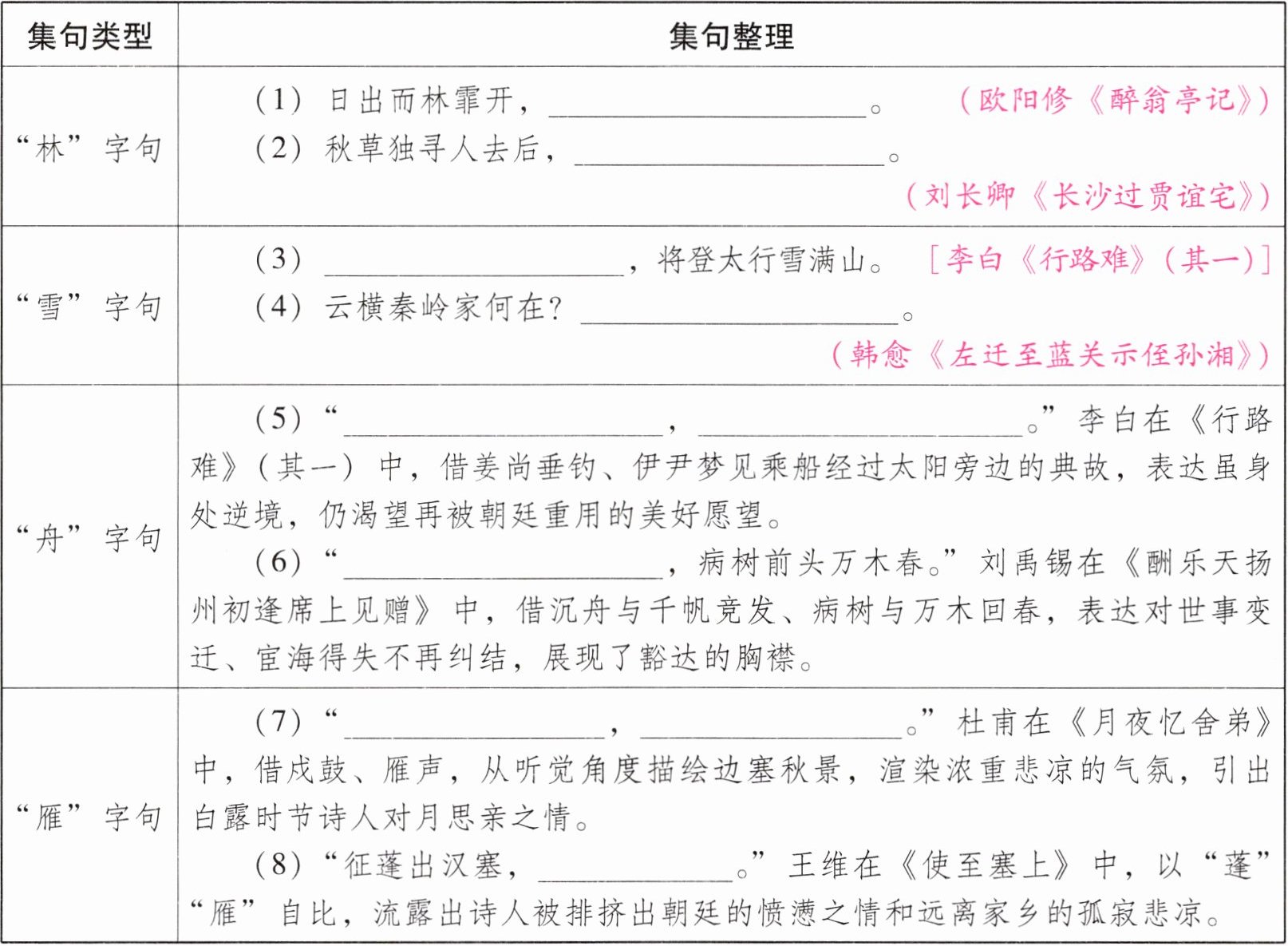 |“雪”字句|(3)______,将登太行雪满山。[李白《行路难》(其一)](4)云横秦岭家何在?______。(韩愈《左迁至蓝关示侄孙湘》)|