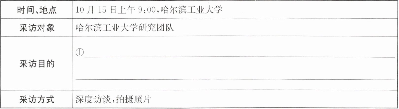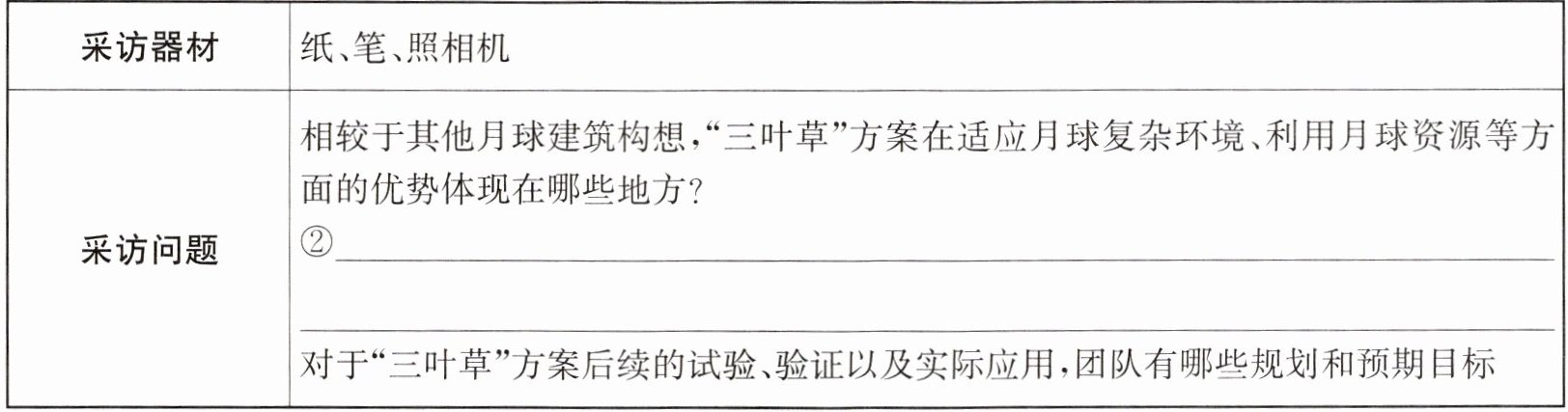 1. 小语负责文学社的采编工作,读完上述材料,她对月球基地建设非常感兴趣,决定去采访“三叶草”月球建筑方案的负责团队。请你结合材料以及情境,补全采访提纲。