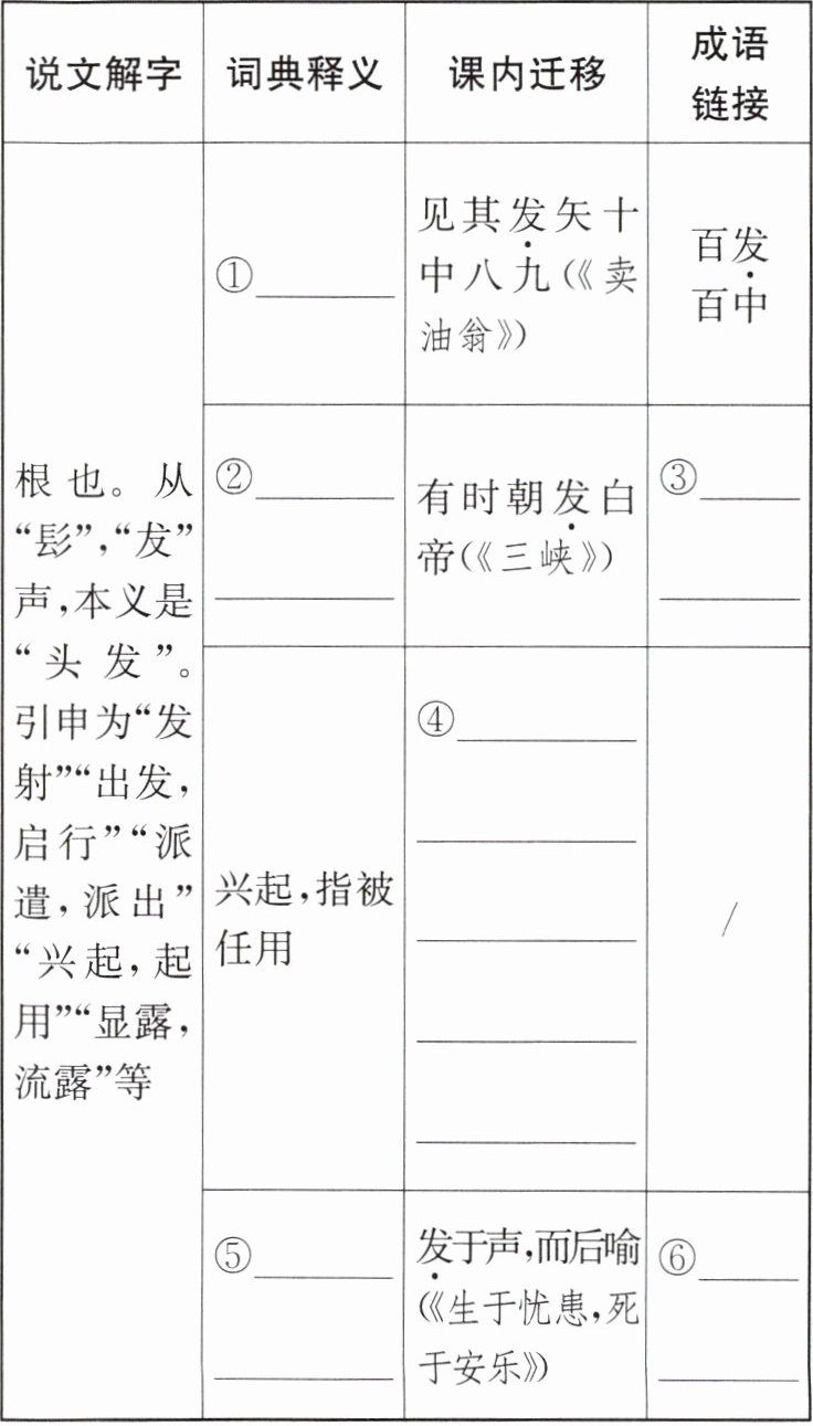 【拓展空间】①发射 ②出发,启行 ③整装待发 ④舜发于畎亩之中(《生于忧患,死于安乐》) ⑤显露,流露 ⑥厚积薄发