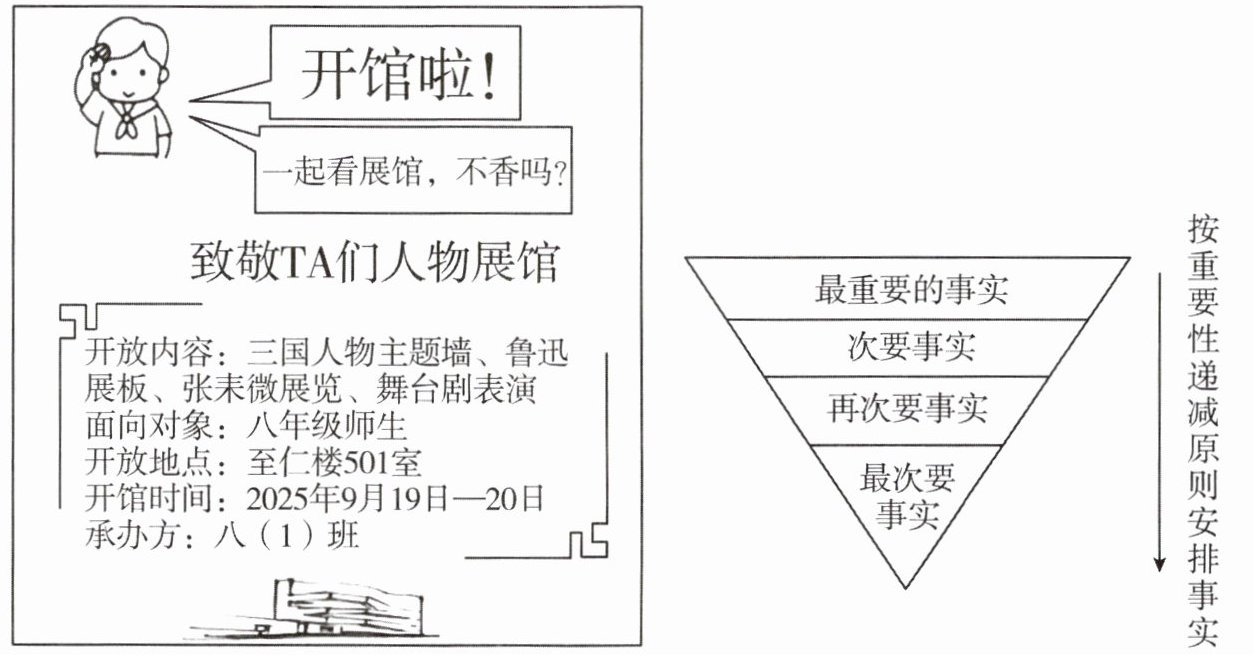 2. 我向“项目化基地校”打造献份礼——“致敬TA们”人物展馆开馆了。请参照下面海报和倒金字塔结构,代活动负责人小安写一则消息。要求:条理清晰,表达得体,标题自拟,电头省略,不少于120字。