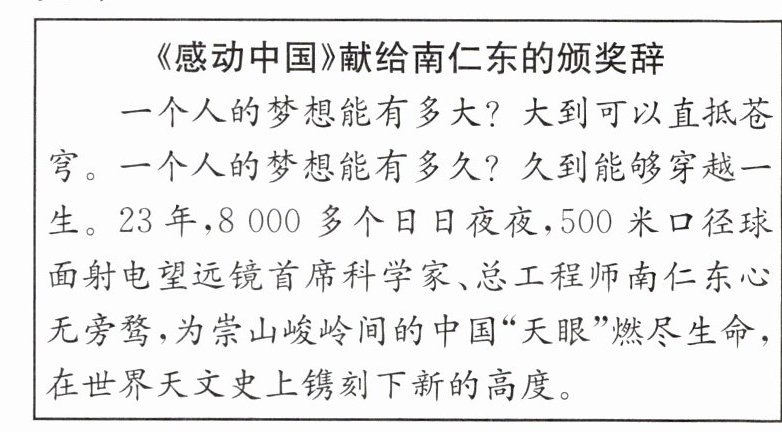 8. (示例)一个人走多远才能抵达梦想彼岸?是从喧嚣的城市抵达荒凉的大漠。一个人走多久才能看见真理的曙光?是从意气风发奋斗至年近不惑。16年,5800多个日夜,大漠的油田勘探工作者黄少英,与风雪作伴,让中国油田勘探工作向大地更深处进军。
