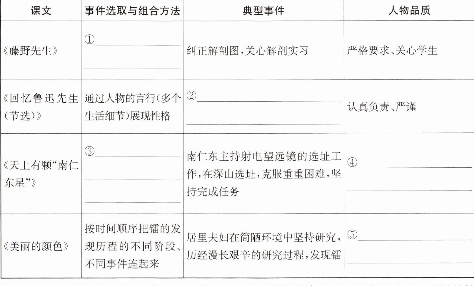 1.【联读课文,学以事写人】如果你要写人,就不要用标签随意定义人物性格,而是让品质透过行为的点滴自然展现,也就是要学会“以事写人”。本单元的四篇课文中,作者通过典型事件的筛选和组合,将一个个饱满鲜活的光辉形象推到我们眼前。请仔细阅读课文,并完成下表。
