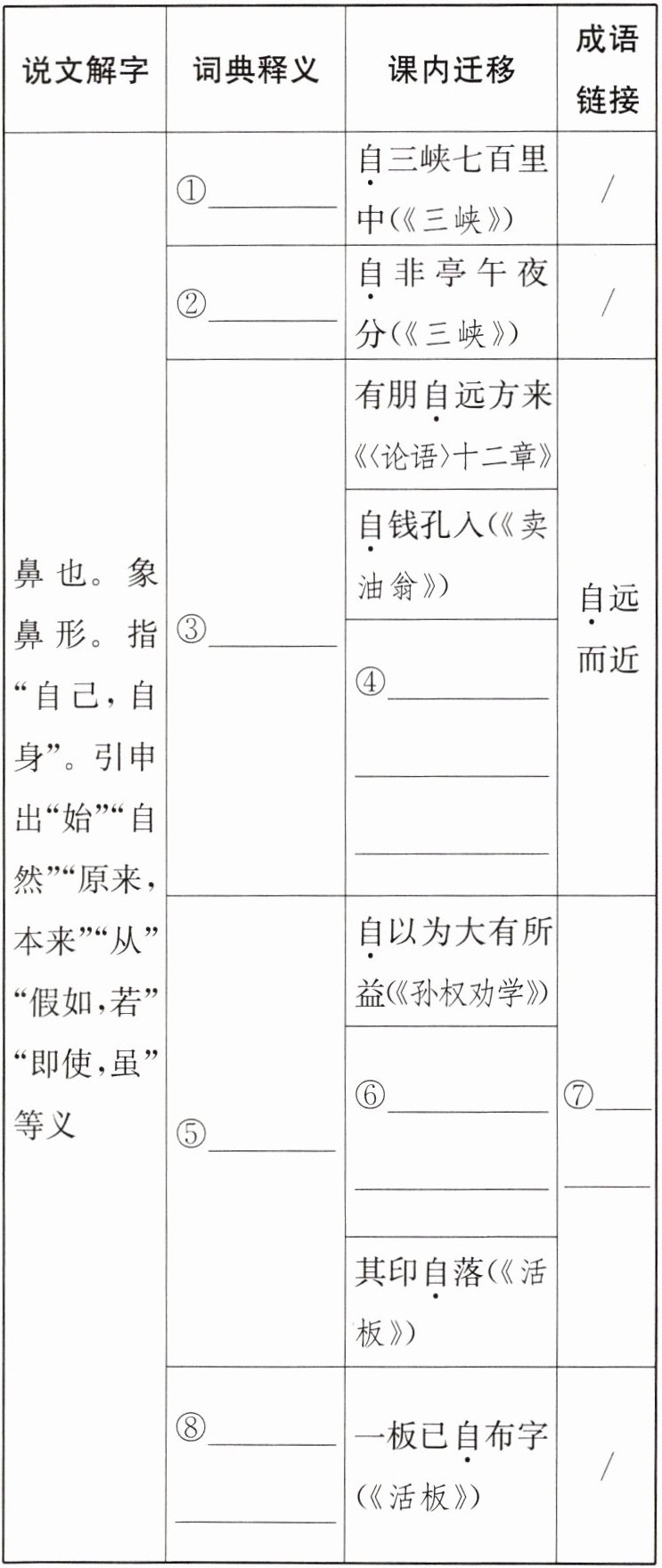 【拓展空间】①在 ②如果 ③从 ④自李唐来(《爱莲说》) ⑤自己 ⑥公亦以此自矜(《卖油翁》) ⑦自力更生 ⑧另自,另外