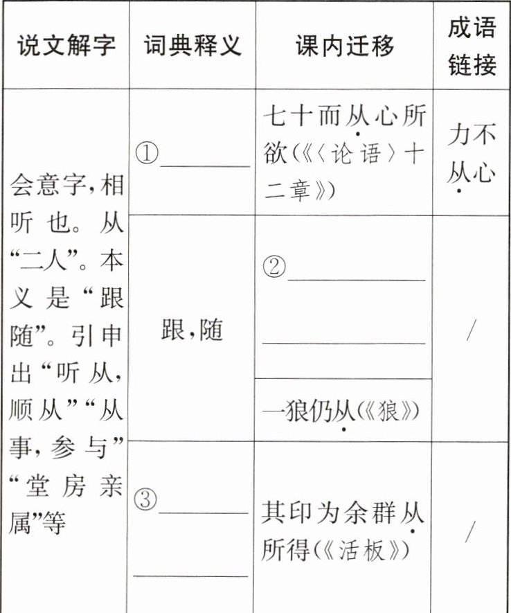 【拓展空间】①顺从 ②从流飘荡(《与朱元思书》) ③堂房亲属