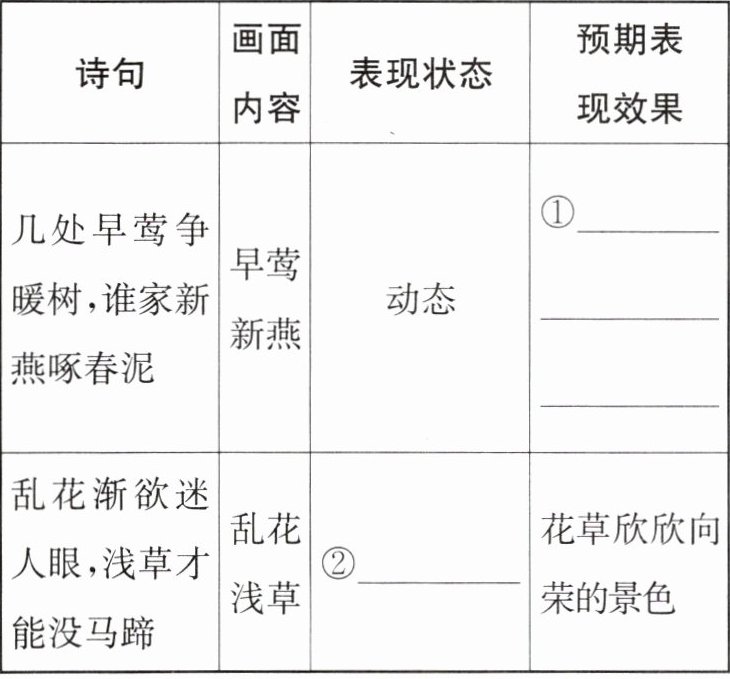 12.C 【解析】 C项,本诗描绘的是西湖生机勃勃、欣欣向荣的明媚景象,而“国破山河在,城春草木深”描绘的是国都沦陷,城池残破之景,虽然山河依旧,可是乱草遍地,林木苍苍。二者所营造的意境不同。 13.①啼莺争树、泥燕剪风的春景 ②静态