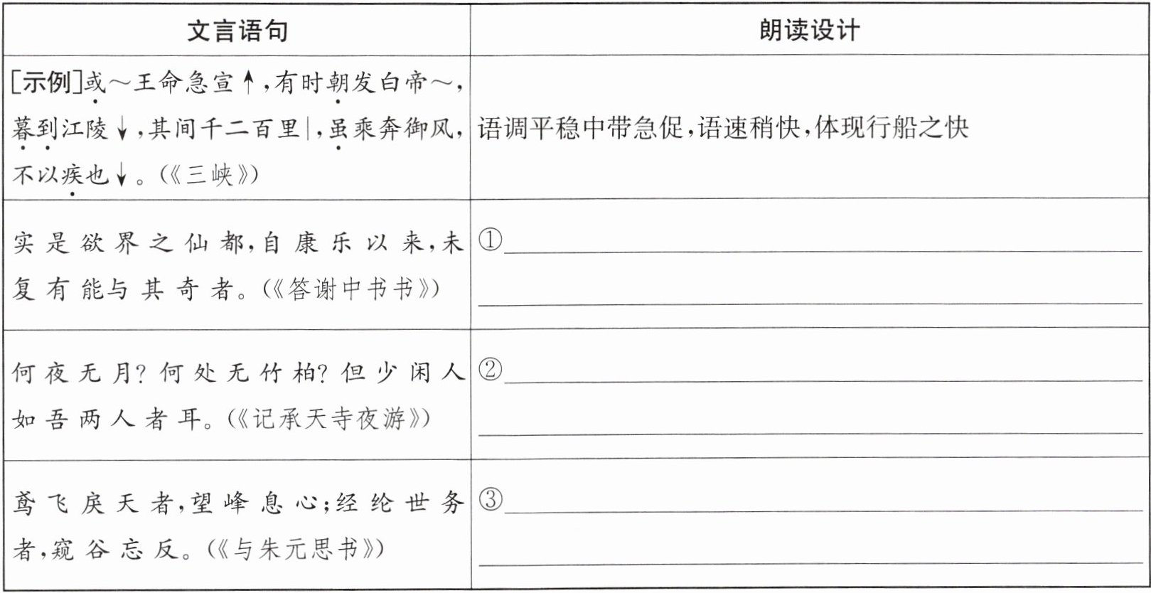 ③鸢飞戾天者,望峰息心;经纶世务者,窥谷忘反。(《与朱元思书》) (示例)语速渐快,语气加强,重读“望峰”“窥谷”,接着以舒缓语气读“息心”“忘反”,以表达惊羡忘俗之情