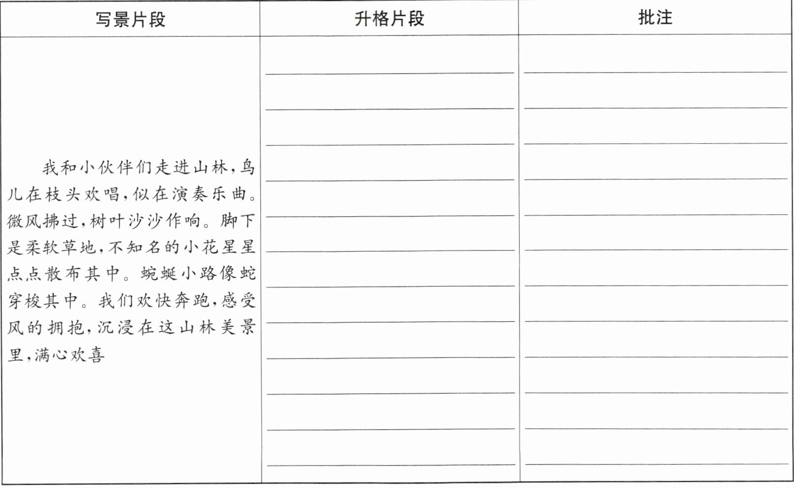 (2)【文段升格】请反复品味本单元文言文,注意用语、句式、韵律方面的特点,运用相关技巧,对下面的写景片段进行升格,并做出批注。