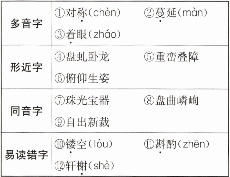 1.D 【解析】 ③着眼(zhuó),⑤重峦叠嶂,⑦珠光宝气,⑨自出心裁,⑫轩榭(xiè)。